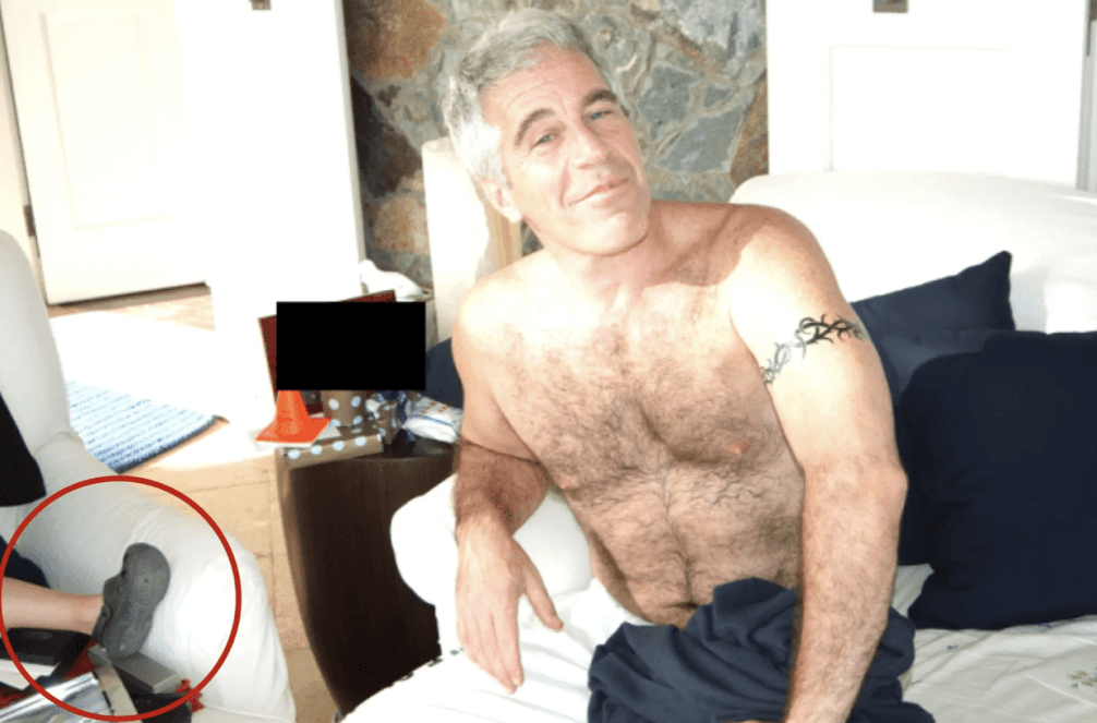 《纽约邮报》的其中一张爱泼斯坦档案照中,爱泼斯坦赤裸身体坐在梳化床上,旁边的座椅有一只疑似小童的脚。