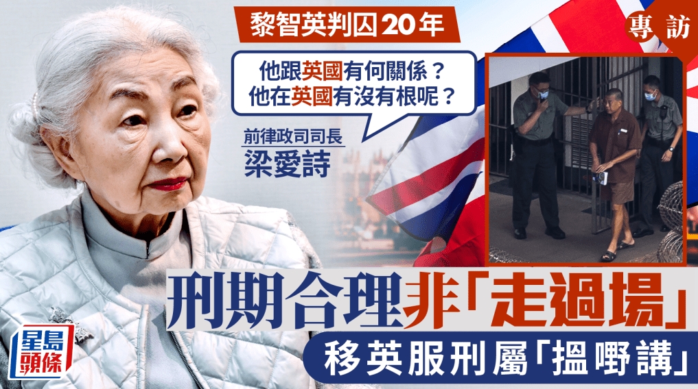 黎智英持有英国护照,外界关注西方会否以外交途径处理,甚至申请移送他至英国服刑。不过,保安局长邓炳强日前指黎智英是中国人,他在香港犯法及服刑是合理。梁爱诗认为,即使黎是英国公民,“他跟英国有何关系?他在英国有没有根呢?他在香港这么多年”。梁爱诗指,移交在囚人士目的之一,是确保不会被剥夺探访权利,但黎智英太太在香港,要求并不合理,认为这些说法只是“无嘢讲搵嘢讲”。