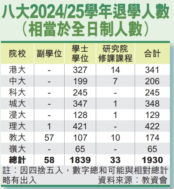 教资会昨公布各资助大学的学生人数,2024/25学年八大共1930名全日制学生退学,较前一年度的2106人减少约8.4%,其中1839人修读学士学位课程,58人修读副学位,33人修读研究院修课课程,均较23/24年度下降。按院校分析,八大退学人数介乎65至422人,其中科技大学在24/25学年共245人退学,全部是本科生,较前一学年增加22人,升幅近一成,是八大中唯一录得退学人数增加的大学。退学人数最多的是理工大学,共422人退学,但较前一年度减少16人,跌幅约3.7%;最少人退学的是岭南大学,共65人退学,均为本科生。