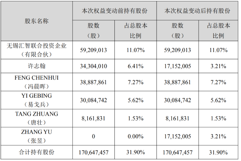 本次权益变动后,许志翰直接持有公司无限售条件流通股份1715万股,占公司总股本的3.21%。张昱无条件且不可撤销地将其持有的公司股份对应的全部表决权、提名和提案权、参会权、监督建议权以及除收益权和股份转让权等财产性权利之外的其他权利全权委托给许志翰行使。