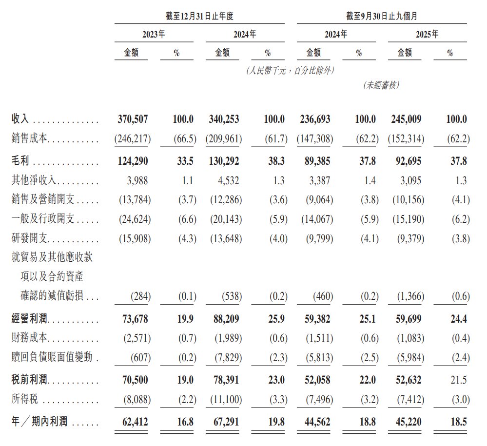 公司于2023年度、2024年度、2024年截至9月30日止九个月、2025年截至9月30日止九个月分别录得毛利约为1.24亿元、1.30亿元、8938.5万元、9269.5万元人民币。同期,公司的毛利率分别为 33.5%、38.3%、37.8%及37.8%。
