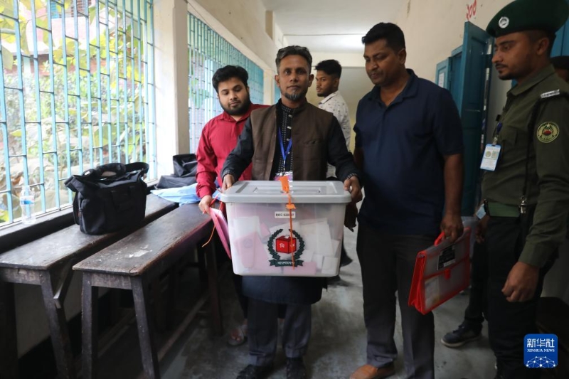 ▲2月12日,在孟加拉国首都达卡,选举工作人员在投票站运送票箱。新华社发(哈比卜·拉赫曼摄)