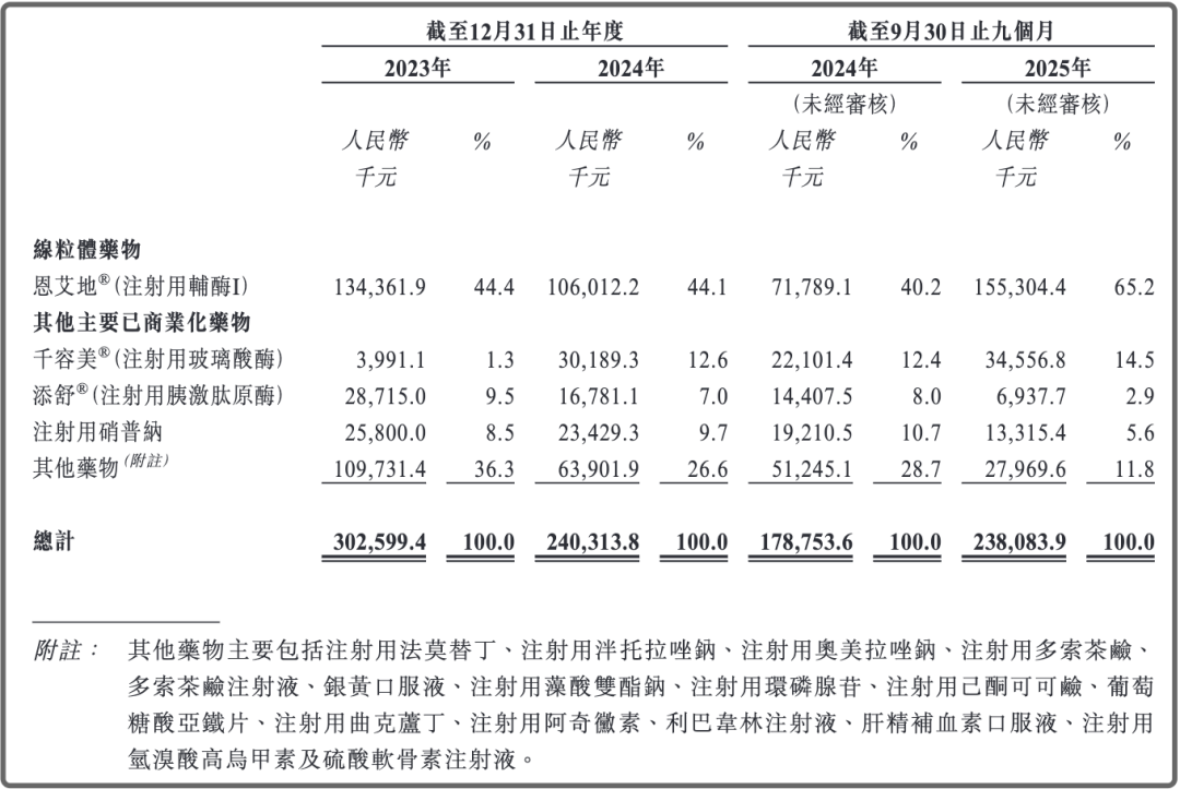 然而从产品端来看,公司的大部分收入来自恩艾地这款早在2000年初就已获批上市的药物,招股书显示,2023年、2024年及2025年前三季度,恩艾地的销售收入分别为1.34亿元、1.06亿元和1.55亿元,占总收入比例从44.4%一路飙升至65.2%。与此同时,公司其他16款仿制药的贡献率则从36.3%骤降至11.8%。