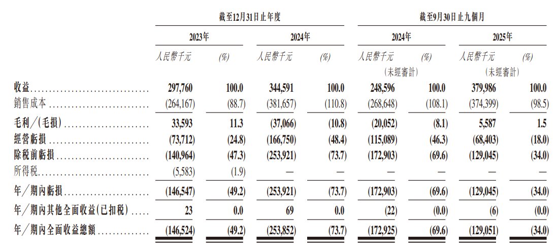 公司于2023年度、2024年度、2024年截至9月30日止九个月、2025年截至9月30日止九个月分别录得毛利约为3359.3万元、-3706.6万元、-2005.2万元、558.7万元人民币。