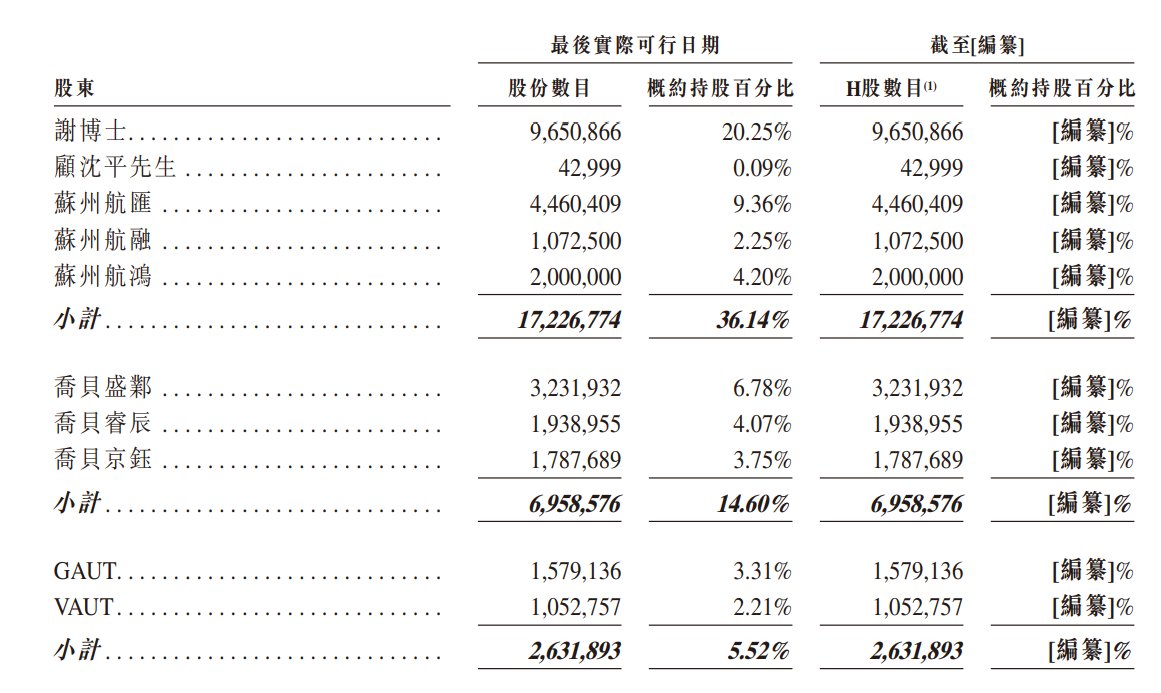 截至2026年2月6日,公司由以下人士持有:(i)谢博士持有20.25%;(ii)苏州航汇持有9.36%;(iii)苏州航鸿持有4.20%;(iv)苏州航融持有2.25%,各自均由谢博士作为普通合伙人控制。
