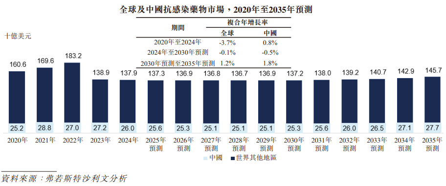 在中国,该市场于2024年达到260亿美元,预计到2030年将达到253亿美元,及到2035年将达到277亿美元。其收缩乃受与大流行相关的就诊人数下降、多轮带量采购导致药价下降以及更严格的抗生素管制政策所驱动。