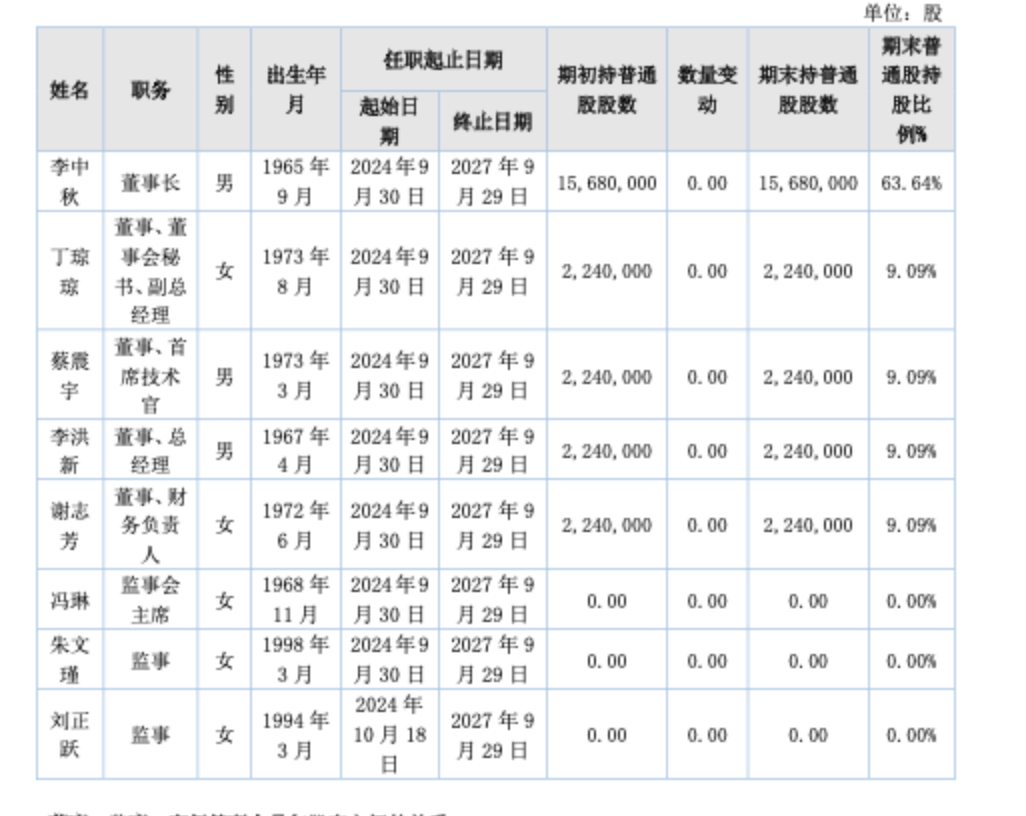 2025年中报显示,李中秋为董事长,丁琼琼为董事兼董事会秘书,董事会与高管人员名单中无独立董事。