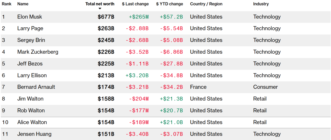 除了黄仁勋之外,科技行业的富豪今年几乎都经历了财富的缩水,例如当前排名第二和第三的谷歌两位创始人Larry Page和Sergey Brin,两人身家均下降超过50亿美元。