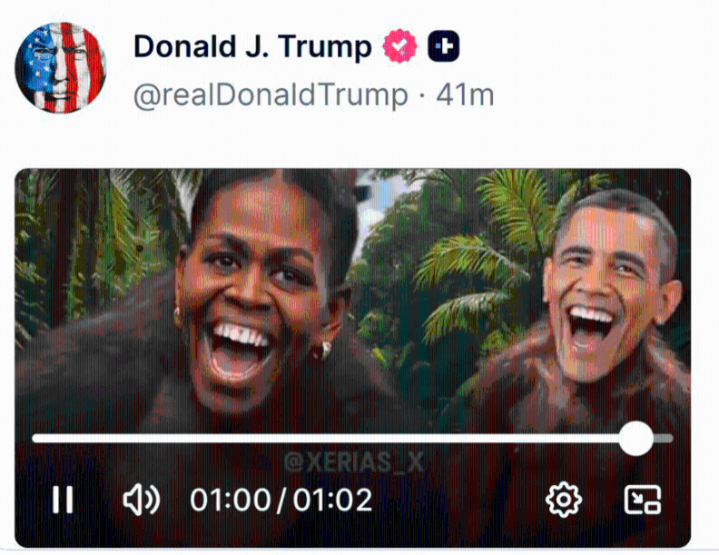 这段影片上周出现在特朗普的真实社群(Truth Social)账号中,内容原为讨论2020年美国大选投票争议的影片片段,后段则出现奥巴马夫妇被合成为猿猴形象的画面。相关内容随后引发共和、民主两党议员批评,最终遭到下架。白宫事后表示,该贴文是由工作人员误发。