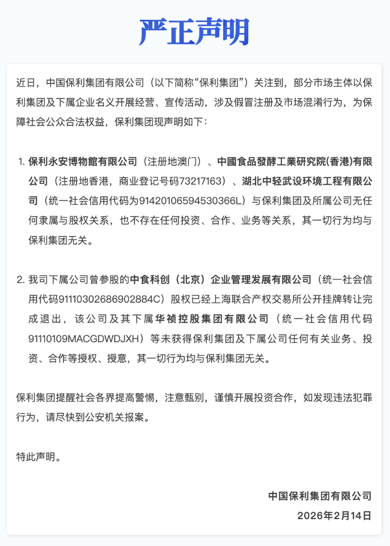 14日,中国保利集团有限公司(以下简称“保利集团”)在其官方公众号发布严正声明。