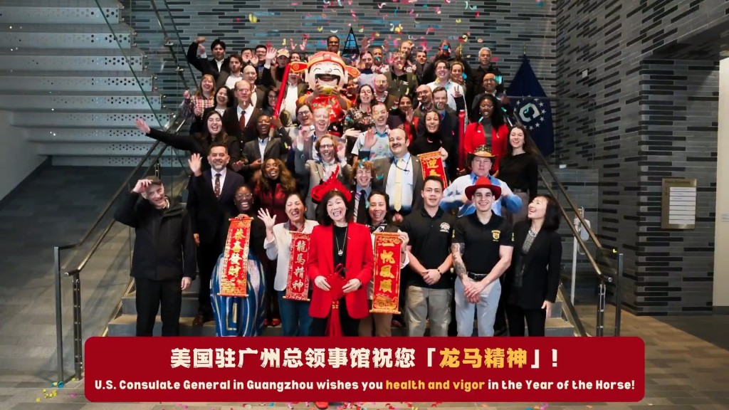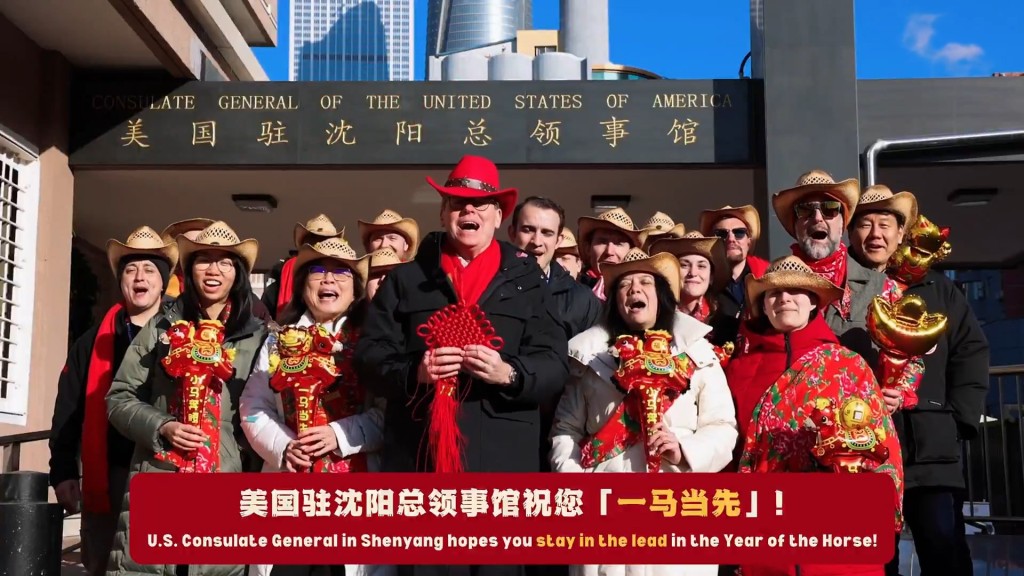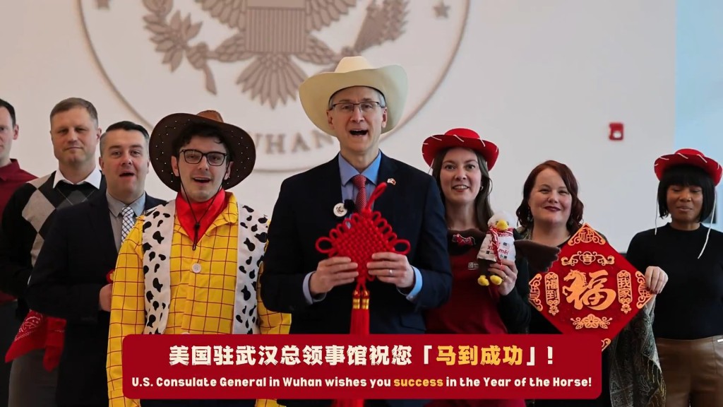 美国驻华使领馆在X发帖写道:“春风得意马蹄疾,牛仔起舞贺新禧。请查收美国驻华使领馆外交官倾情出镜、“马上”送达的新春祝福。祝大家马年红红火火,福气满满,吉祥如意!”影片相信是美国驻华使领馆外交官一身牛仔装,跳牛仔舞的画面。最后,影片亦出现多个美国驻内地的总领馆人员向中国人拜年画面。