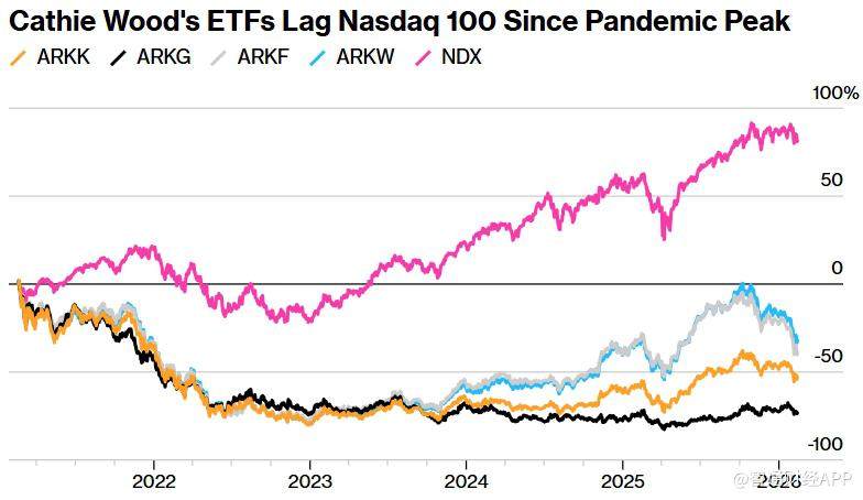 由伍德掌舵的旗舰产品,ARK Innovation ETF(ARKK.US)本月早些时候录得史上最长的连续下跌纪录,连续10个交易日收跌。拉长时间来看,在过去五年这一横跨疫情后期、加息周期以及市场反弹的阶段里,ARKK累计跌幅超过50%,而同期纳斯达克100指数却上涨了约80%,两者表现差距显著。