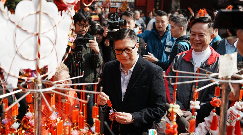 今日(18日)是农历大年初二,适逢车公诞,保安局局长邓炳强特意前往车公庙视察,并为在场当值的前线人员加油打气,期间向市民问好。他祝愿国泰民安、香港继续保持安全平稳,经济能够更进一步发展,最后花费88港元购买车公庙小风车吊饰。