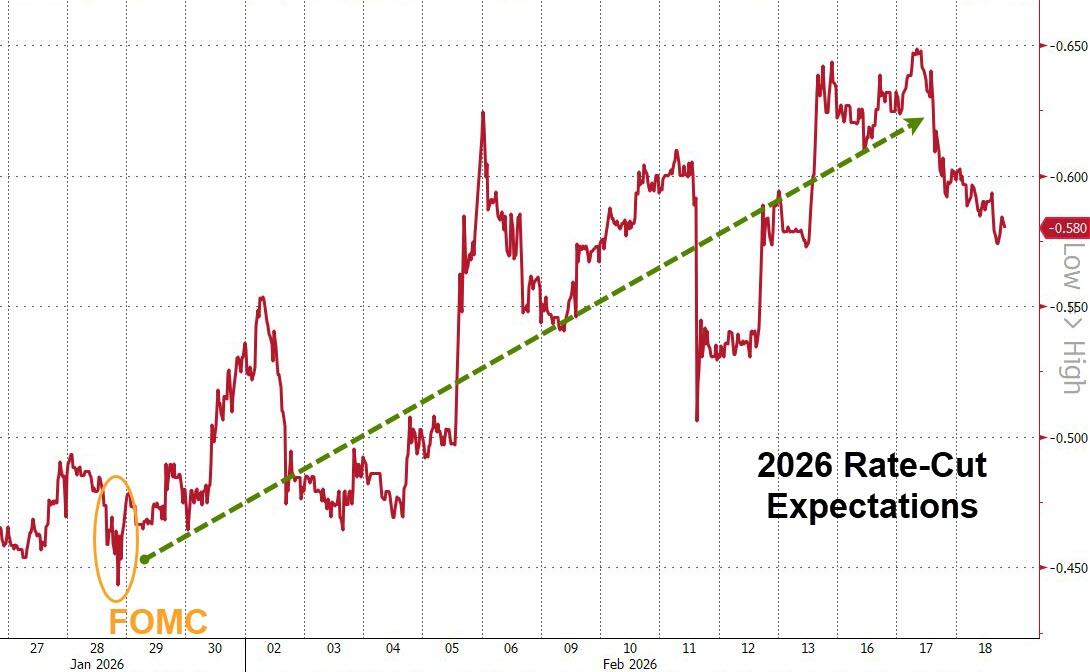 上周公布非农就业强劲增长后,市场排除3月降息可能,全年降息预期相比1月末会议时仍偏鸽