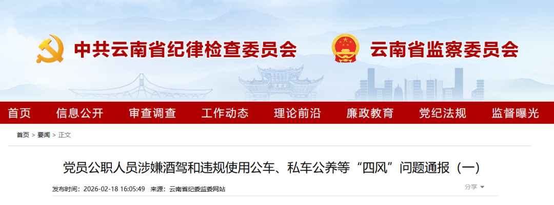 此前,即2026年2月13日,云南省纪委监委发布公告称,将于春节期间(2月18日至2月22日期间)对该省党员、公职人员涉嫌酒驾、按照《中国共产党纪律处分条例》《中华人民共和国公职人员政务处分法》应当受到党纪政务处分的典型行为和违规使用公务用车、私车公养的典型问题进行公开通报。