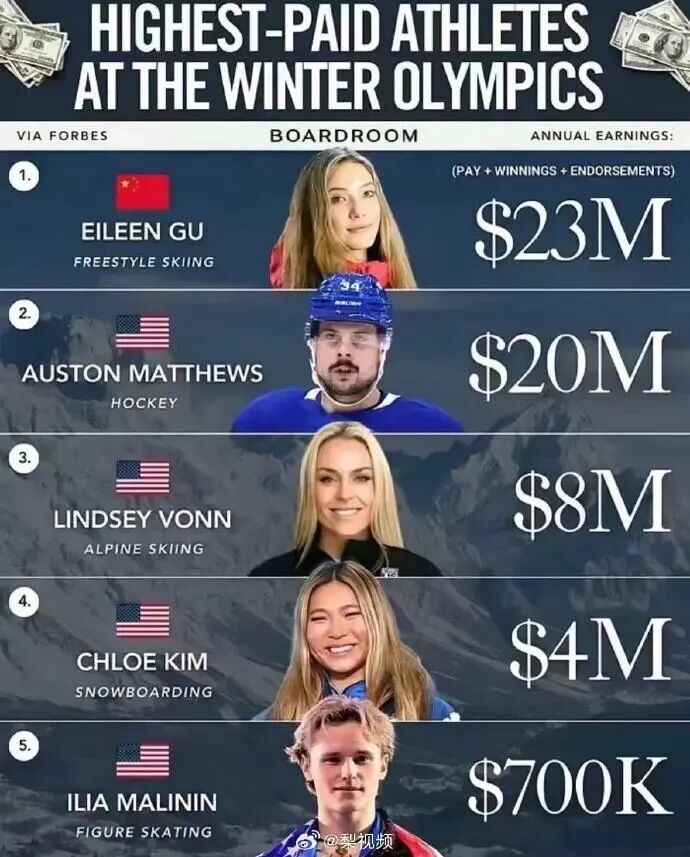 首页>时事 福布斯发布:谷爱凌收入排名第一 发布时间:2026-02-24 10:51 近日,商业媒体福布斯发布了本届冬奥会运动员收入排行榜前五名,谷爱凌以2300万美元的收入排名第一。以下是米兰科尔蒂纳冬奥会五大热门项目中收入最高的运动员:1-谷爱凌:自由式滑雪,2300万美元2-奥斯顿·马修斯:冰球,2000万美元3-林赛·沃恩:高山滑雪,800万美元4-克洛伊·金:单板滑雪,400万美元5-伊利亚·马利宁:花样滑冰,70万美元 来源︱中国新闻周刊综合自越牛新闻、大河报 编辑︱林木 热门文章 航天科研人员赵学军,到国外就被策反,央视披露详情 中方宣布:默茨将访华 重磅!美国海关将从2月24日起停止征收被最高法院裁定违法的关税 美方称“中国只需打一个电话,就能结束俄乌冲突”,外交部回应 “从未如此精心准备”,德媒:默茨将率“庞大商务代表团”访华 总票房突破80亿,全球第一! 美国被曝已决定对伊朗发动军事打击,预计23日或24日 特朗普海湖庄园︱持燃料罐枪手身份曝光,竟是21岁死忠特粉,全家支持特朗普 俄罗斯贝加尔湖|车辆沉湖致8死事发影片曝光,1人奋力抓绳索逃生 问界通报“广东惠州车辆起火事件” 专题 更多 >