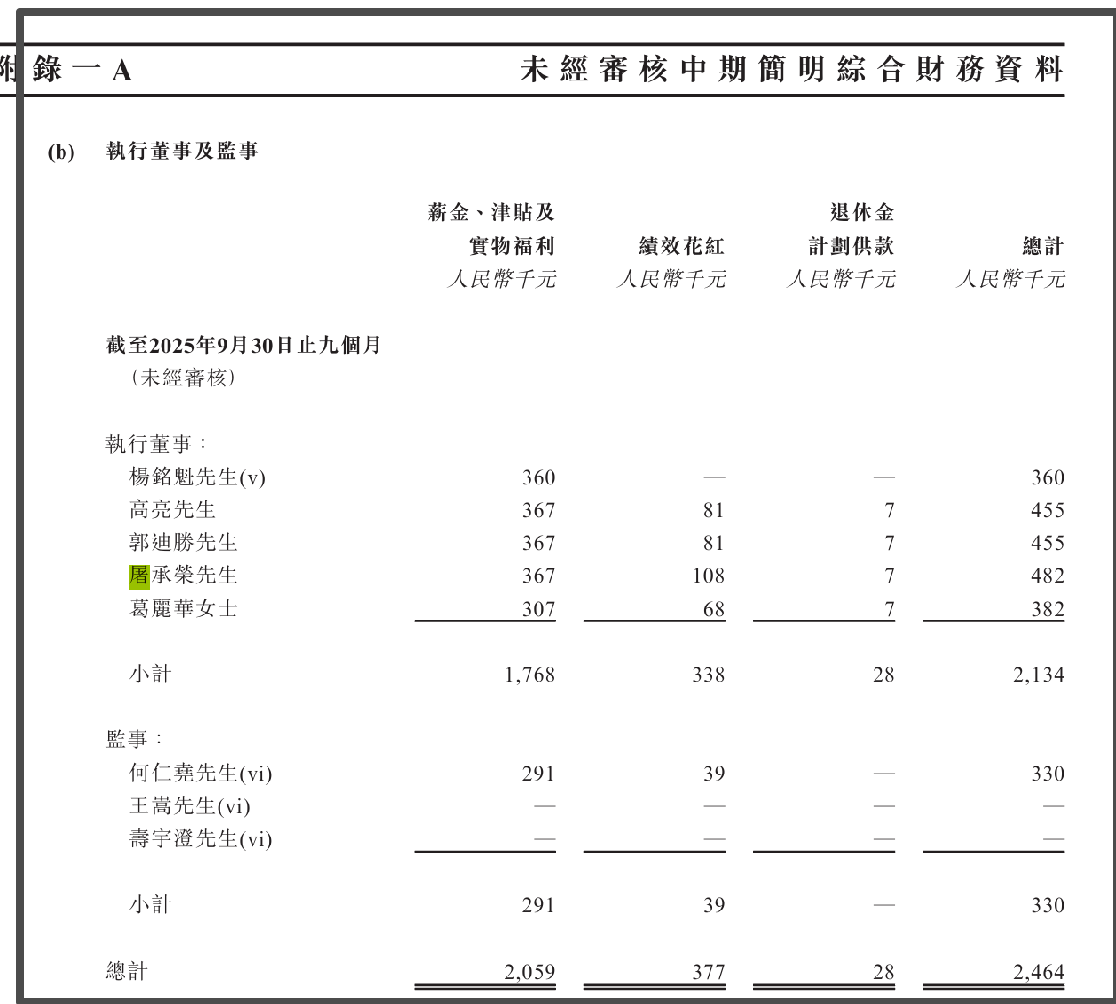 而在未经过审计的2025年中期业绩中,杨铭魁2025年前九个月的薪酬低至36万元。