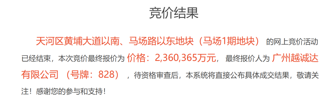 最终经过将近9小时、243轮竞价,越秀旗下广州越诚达有限公司战胜保利,以总价236.04亿元拿下地块,总价仅次于2009年出让的广州亚运城地块(255亿元);折合楼面价超过8.5万元/平方米,则刷新广州楼面价新纪录。