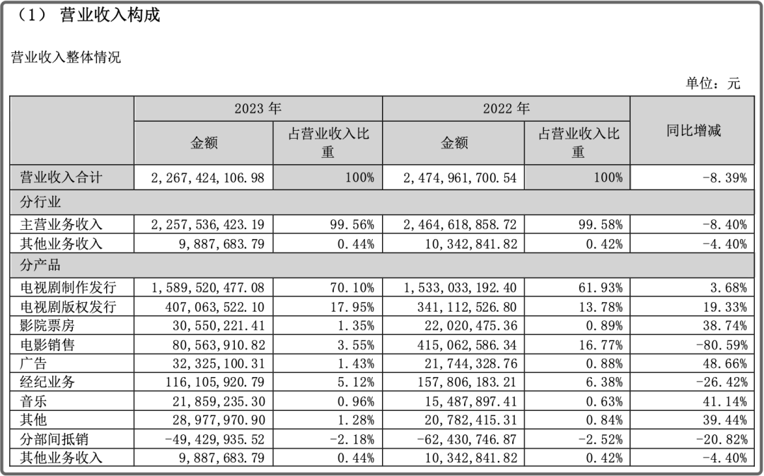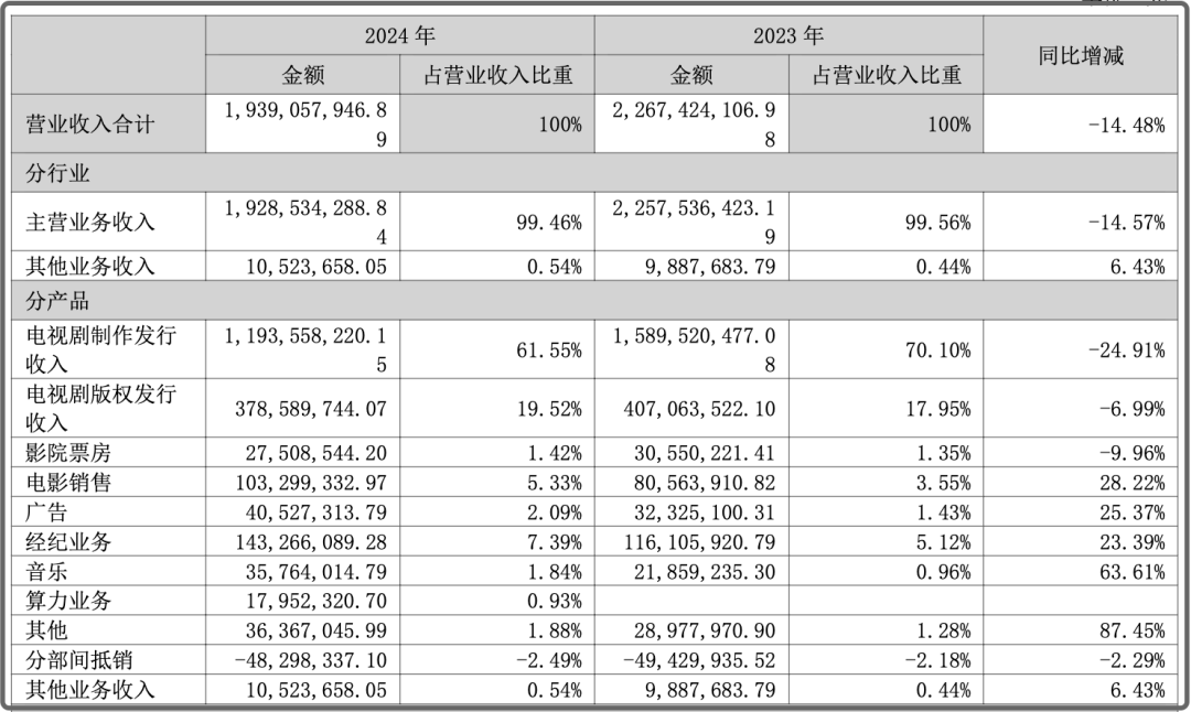 具体来看,电视剧是公司主要收入来源,电影贡献的收入则较为有限。2022年-2024年,来自电视剧制作发行和电视剧版权发行的收入分别占到了公司总收入的75.71%、88.05%、81.07%;来自影院票房和电影销售的收入分别占到了总收入的17.66%、4.9%、6.75%。