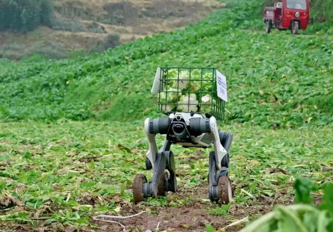 ▲绝影X30四足机器人在涪陵榨菜田运输青菜头