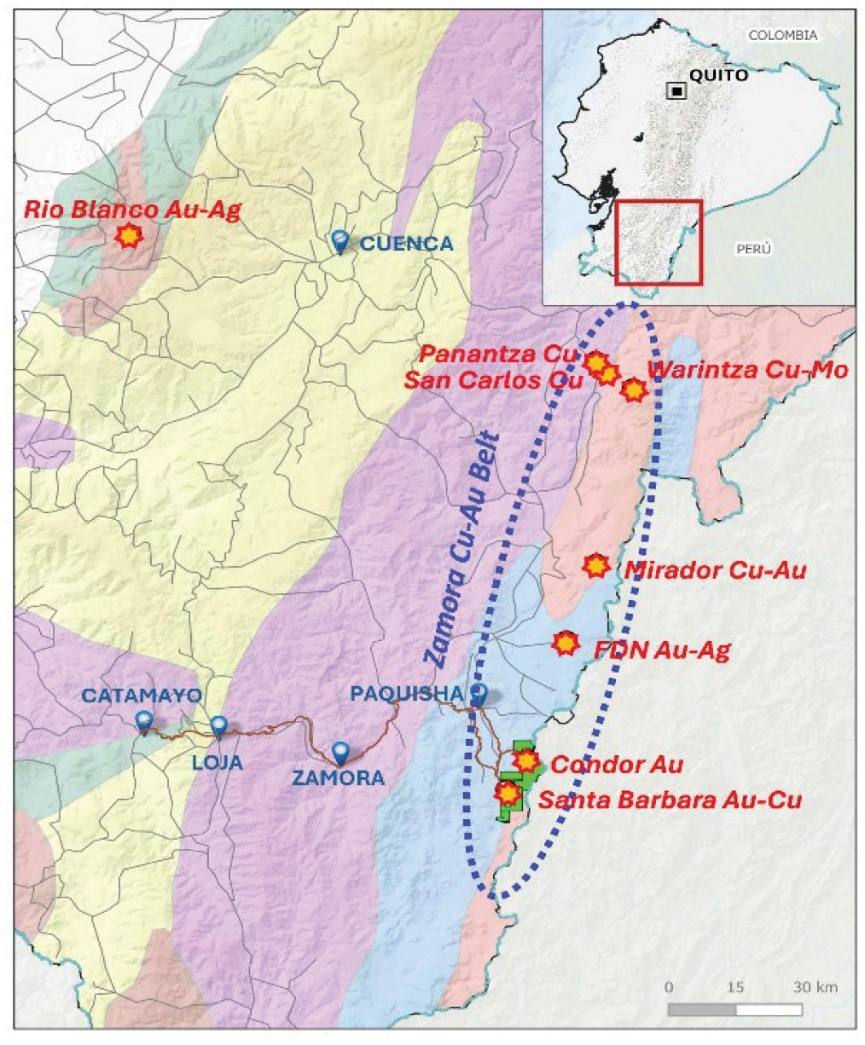 该项目位于厄瓜多尔东南部的萨莫拉-钦奇佩省,距离萨莫拉市约76公里,位于萨莫拉铜金成矿带内,毗邻多个已投产或在建大型矿山。在希尔威旗下Condor项目以南10公里,距Lundin Gold运营的Fruta del Norte金矿36公里、 Mirador铜金矿56公里、 Solaris Resources开发中的Warintza项目96公里,处于成熟矿业集群的核心辐射范围内,具有显著的区位优势。