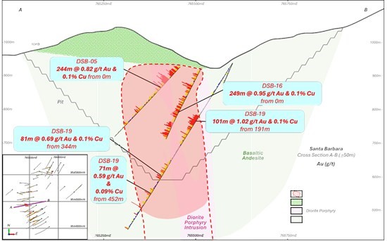 Santa Barbara金铜矿有52平方公里的勘探许可证。根据2021年7月公布的NI43-101技术报告,已有控制级别矿石量3980万吨,资源量金26.71吨、铜4.23万吨以及银31吨,平均品位金0.67克/吨,铜0.11%和银0.8克/吨;另外有推测级别矿石量1.667亿吨,资源量金86吨、铜16万吨以及银152吨,平均品位金0.52克/吨,铜0.1%和银0.9克/吨。