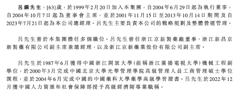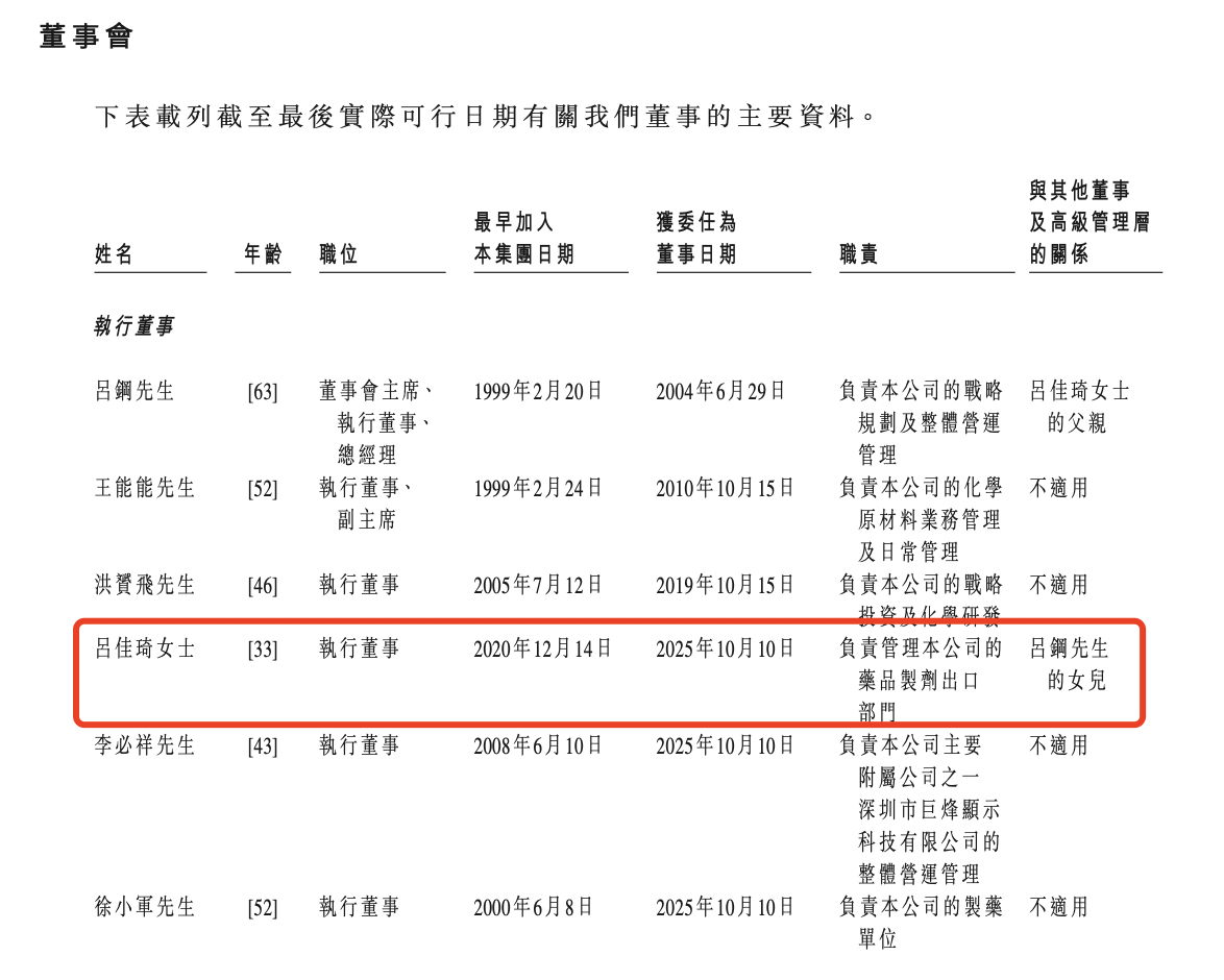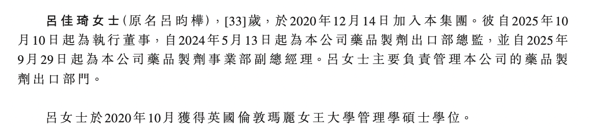 吕佳琦 (原名吕昀桦)为吕钢的女儿,33岁,于2020年12月14日加入集团。其自2025年10月10日起为执行董事,自2024年5月13日起为公司药品制剂出口部总监,并自2025年9月29日起为公司药品制剂事业部副总经理。吕佳琦主要负责管理公司的药品制剂出口部门。