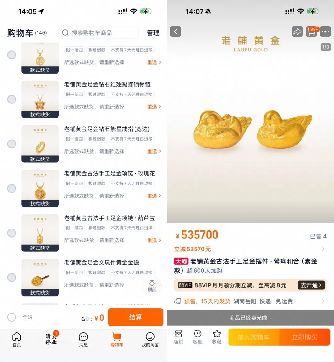 记者在现场观察到,队伍中有不少外地专程赶来的消费者,还有人自带了小马扎。期间很多人都在用手机持续刷新老铺黄金的线上店铺,时不时能够捡漏到一两件商品。伴随线上折扣活动的展开,人们将“老铺黄金买得几乎只剩下‘老铺’”,甚至连30多万的黄金蟾蜍、50多万的黄金鸳鸯摆件等都快速售罄。