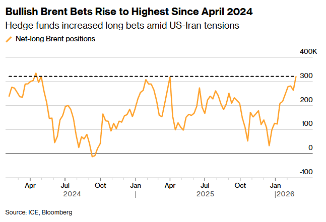 由于投资者愈发担忧美国可能即将在中东采取军事行动并扰乱该地区石油供应,对冲基金对布伦特原油的看涨情绪达到自2024年4月以来最高水平。洲际交易所欧洲期货市场数据显示,截至2月24日当周,基金经理将其布伦特原油净多头头寸增加57,766手,至320,952手,为近两年来的最高水平。美国商品期货交易委员会(CFTC)的数据显示,对美国WTI原油的看涨押注也升至七个月高点。