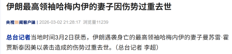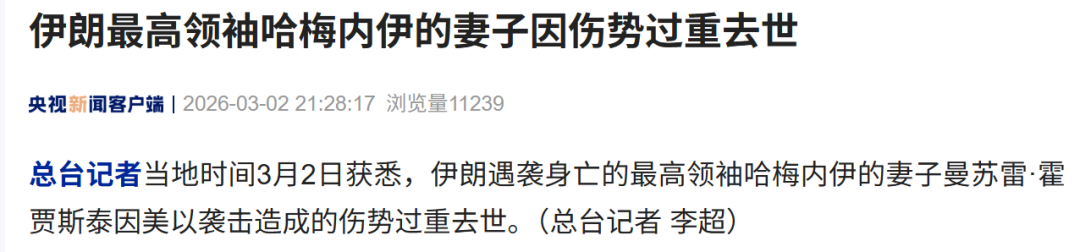 首页>全球 伊朗最高领袖哈梅内伊的妻子因伤势过重去世 发布时间:2026-03-02 21:39 当地时间3月2日获悉,伊朗遇袭身亡的最高领袖哈梅内伊的妻子曼苏雷·霍贾斯泰因美以袭击造成的伤势过重去世。 来源︱央视新闻 编辑︱胡影雅 热门文章 伊朗:美国中情局6官员在阿联酋身亡 伊朗前总统内贾德遇袭身亡 伊朗临时领导委员会已成立;特朗普同意和伊朗新领导层对话,对伊军事行动或持续4周 美以对伊朗“斩首“行动为何成功?内情曝光 内贾德亲信:内贾德一切安好;内贾德家属发声 急了?吴宗宪出线…民进党狂轰,侯汉廷曝关键:神兵天降 “英国宣布新一轮涉俄制裁,涉多家中国企业”,商务部回应 伊朗:不会与美国进行谈判 伊朗导弹反击 | 突破以国防御系统,击中耶路撒冷及另一城,酿9死6伤11失踪 美攻伊引恐怖袭击报复?德州酒吧枪击案酿3死14伤,枪手穿伊朗国旗图案上衣 专题 更多 >