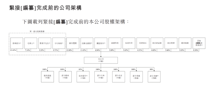 诺令生物的单一最大股东集团包括毛雯、景宁诺令、曹贵平及令行海南。IPO前,毛雯、景宁诺令、曹贵平及令行海南各自分别直接持有公司已发行股份约7.14%、21.41%、5.35%及0.71%,合共约为34.61%。