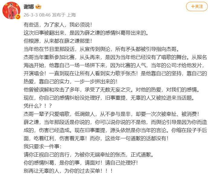 3月3日,谢娜发微博喊话薛之谦,要求他向张杰道歉,全文如下: