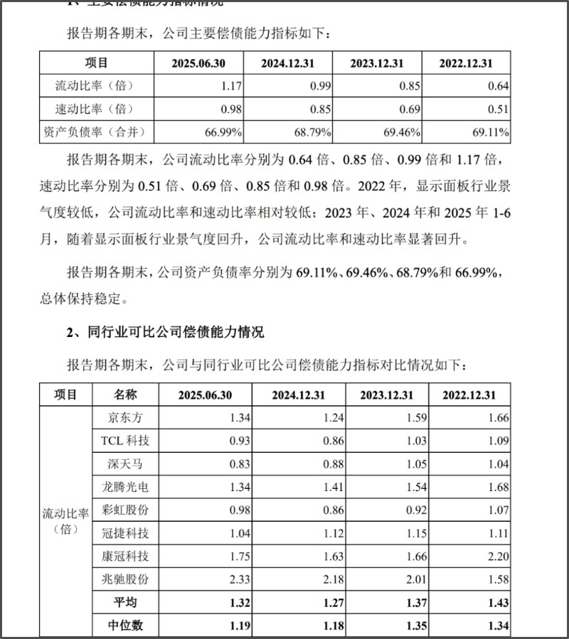 从偿债能力指标来看,惠科股份也面临一定的流动性压力。2022年末至2025年6月30日,惠科股份合并口径资产负债率分别为69.11%、69.46%、68.79%和66.99%,虽呈小幅下降趋势,但仍处于较高水平;流动比率和速动比率虽逐步改善,2025年6月末分别达到1.17倍和0.98倍,但相较于行业平均水平仍存在差距,短期偿债能力有待提升。此外,公司货币资金中包含一定规模的一年以上定期存款和大额存单,流动性受到一定限制,进一步加剧了资金调度压力。