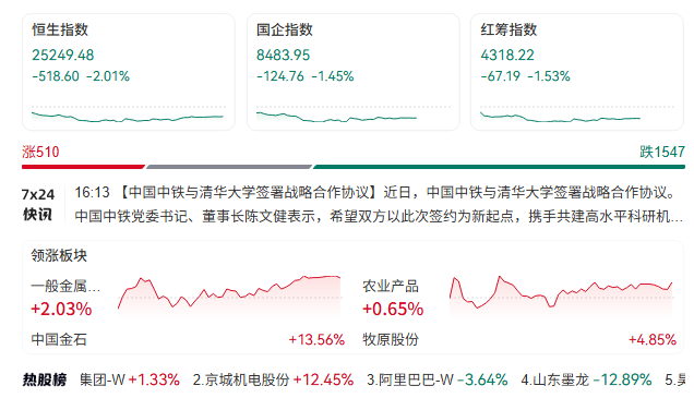 3月4日消息,港股三大指数集体下跌。截至收盘,恒生指数跌2.01%,报25249.48点,恒生科技指数跌0.96%,国企指数跌1.45%。