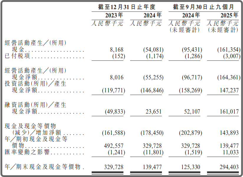 具体来看,公司的现金及现金等价物从2023年的3.3亿元下降至2024年的1.39亿元,尽管2025年前三季度已经增加至2.94亿元,但仍不及2023年水平。同时,2023年公司经营活动产生的现金流量净额为801.6万元,但在2024年即转变为-5525.5万元,2025年前9个月更是扩大到了-1.64亿元。