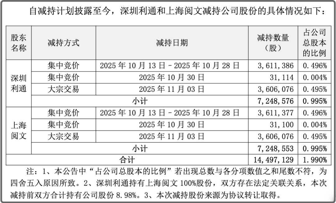 大股东方面,2025年10月13日—11月3日,深圳利通、上海阅文,以集中竞价方式和大宗交易的方式,合计减持1449.71万股,占公司总股本的1.99%。