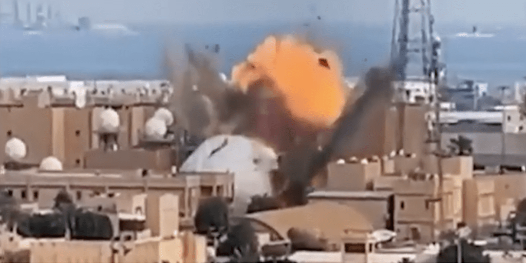 ▲随后画面展示无人机安装在火箭发射器上发射,并剪辑了近日高速击中海湾国家酒店及民居的惨烈片段,向外界展示其远程精准打击能力。
