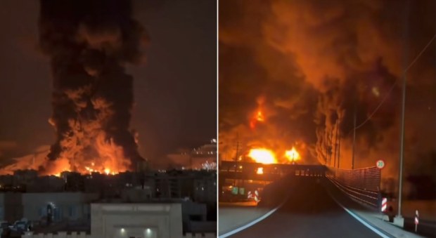 以色列国防军(IDF)在伊朗当地时间7日晚证实打击伊朗多处燃料库,是开战以来首度以伊朗油库为攻击目标。网传影片显示,油库现场火光熊熊,冒出大量浓烟。油库火灾疑似还引起瓦斯管道爆炸,一处街道“连环爆”冒出火光,民众惊恐走避。德黑兰上空笼罩大片黑云,据报空气中瀰漫着浓烈的烧焦与油味。