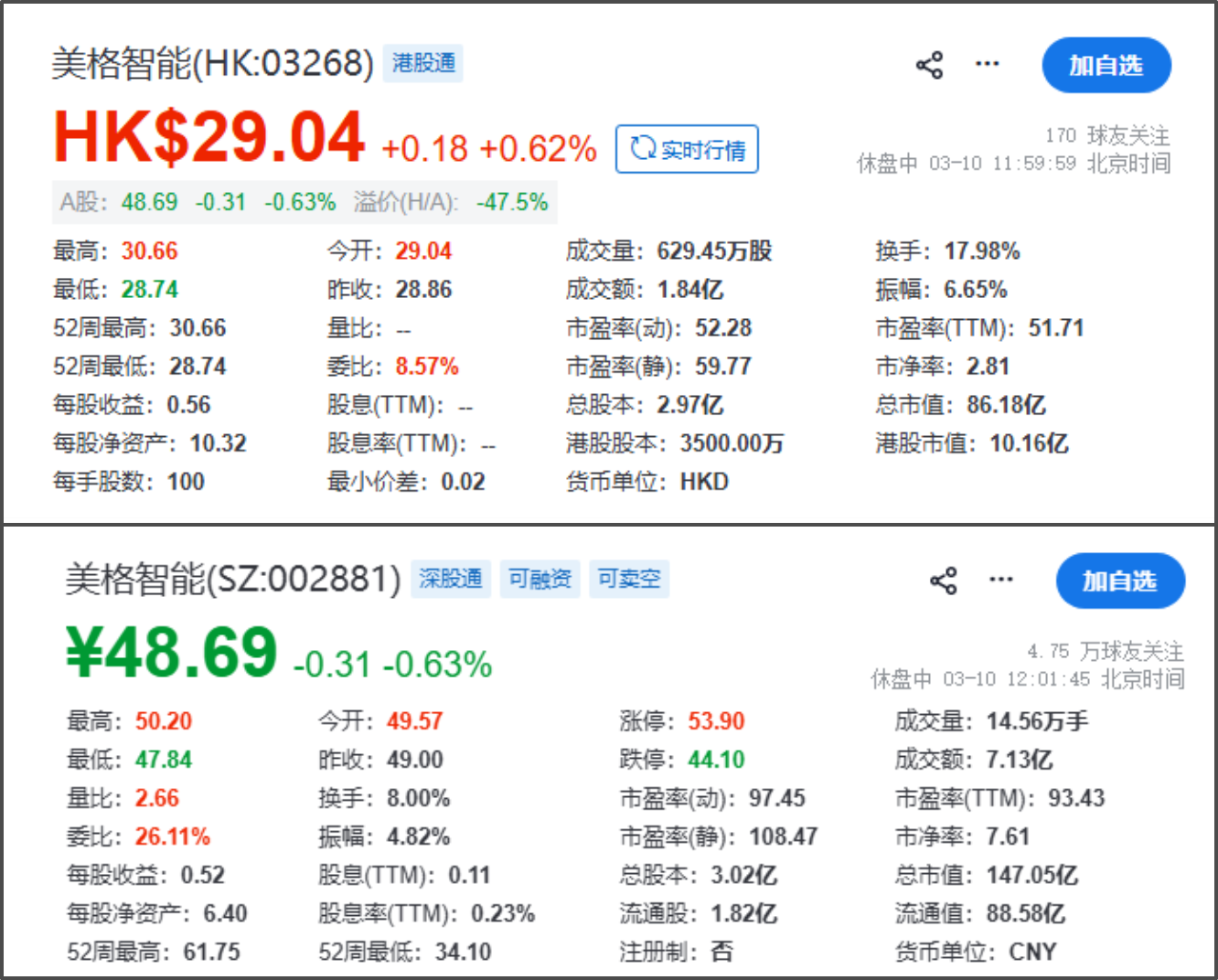 截至3月10日午市收盘,美格智能H股报29.04港元/股,微涨0.62%;A股报48.69元/股,下跌0.63%,总市值147.05亿元。