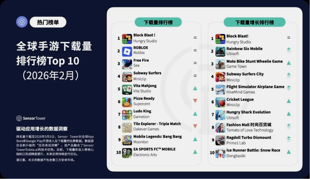 3月10日,全球移动应用数据分析机构Sensor Tower发布了2026年2月全球手游市场简报,重点介绍了全球范围内的最新发布作品、后起之秀以及表现突出的黑马游戏。