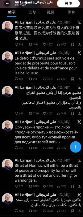 拉里贾尼在社交媒体平台上用6种语言发文写道,“霍尔木兹海峡要么成为所有人的和平与繁荣之道,要么成为好战者的失败与苦难之道。”
