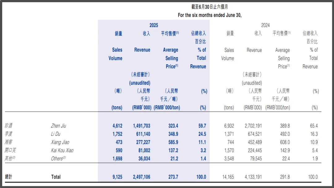 ▲珍酒李渡旗下品牌收入,来源:2025中期报告