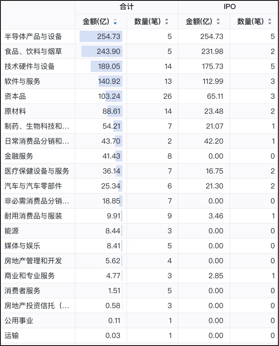 据《星岛》统计,2026年1-2月,港股IPO融资金额共922亿港元,同比增长1067.09%,增长近10倍。年初至今,半导体产品与设备以254.73亿港元的融资金额位列第一,食品、饮料与烟草(融资金额243.9亿港元)和技术硬件与设备(融资金额189.05亿港元)分别位列第二和第三。