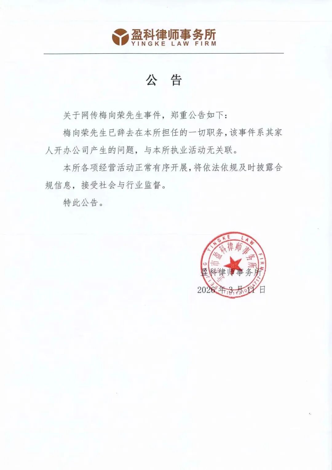 公告称,“梅向荣先生已辞去在本所担任的一切职务,该事件系其家人开办公司产生的问题,与本所执业活动无关联。”同时,“本所各项经营活动正常有序开展,将依法依规及时披露合规信息,接受社会与行业监督。”