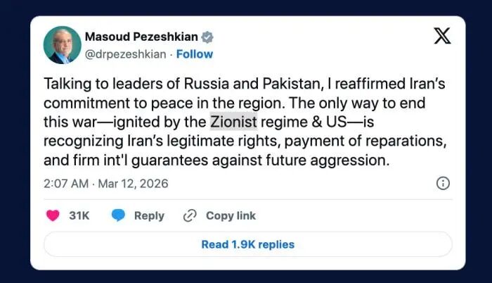 据报道,佩泽希齐扬表示,结束当前由美国和以色列挑起的战争的“唯一途径”,是承认伊朗的合法权利、支付战争赔偿,并由国际社会提供防止未来侵略行为的坚定保证。