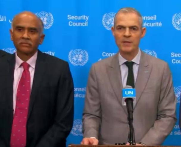 ▲法方代表(右)宣读联合声明内容 图源:法国常驻联合国代表团所发布视频的截图