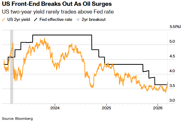 与货币政策预期密切相关的两年期国债收益率周四尾盘一度攀升10个基点至3.75%,此前原油结算价自2022年以来首次站上每桶100美元。这一变动推动该收益率超过了美联储支付给准备金余额的利率,交易员称,由于直接头寸和曲线交易的止损单被触发,这可能会加剧抛售压力。