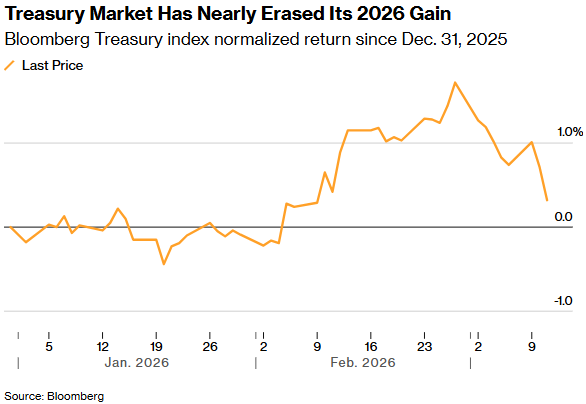 截至周三,彭博美国国债市场表现指标本月迄今已下跌1.4%,年内涨幅收窄至0.3%。截至2月底,美国政府债务的回报率为1.7%。