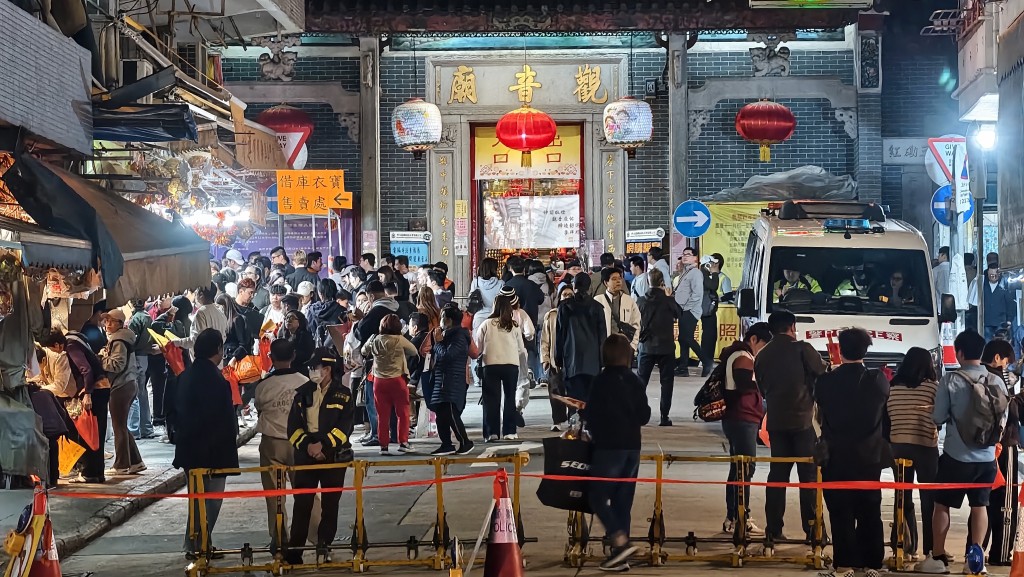 周六(3月14日)是农历正月廿六“观音开库”之日,传统上踏入子时一刻(即3月13日周五晚11时),善信便可进入各大观音庙向观音借库,祈求新一年财运亨通、万事皆成。其中将会通宵开放的借库热点之一红磡观音庙,周五入夜起逾千市民络绎不绝到场,到香烛铺购买衣宝线香等,并到佛光街球场轮候,等候进场一刻,秩序良好。有通宵轮候的前排善信表示,自己去年受庇佑避过一劫,希望新一年观音能继续保佑世界和平,“唔好打仗”。