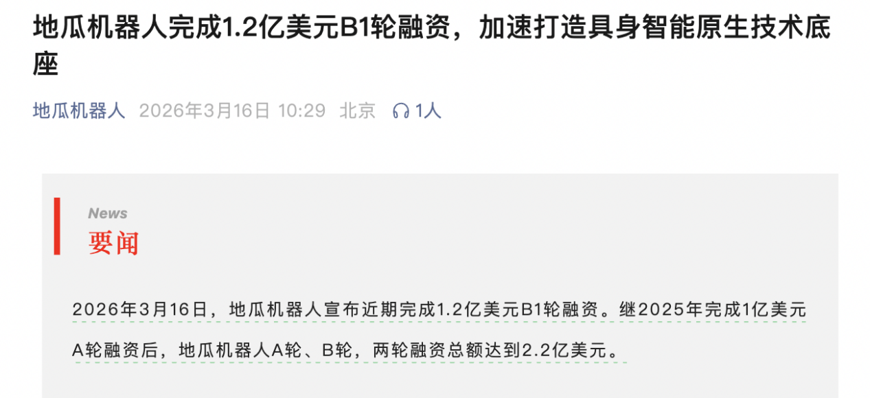 3月16日,深圳地瓜机器人有限公司(以下简称:地瓜机器人)宣布完成1.2亿美元B1轮融资。继2025年完成1亿美元A轮融资后,地瓜机器人A轮、B轮,两轮融资总额达到2.2亿美元。